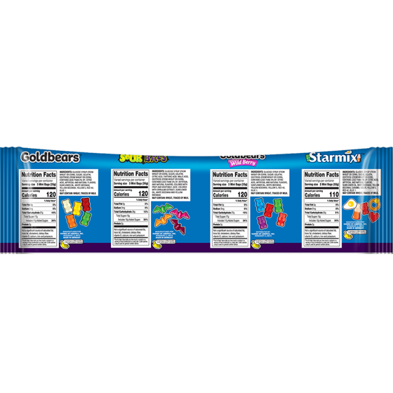 Corn Syrup, Sugar, Gelatin, Dextrose, Citric Acid, Fruit Juice Concentrates (Apple, Orange, Strawberry, Raspberry, Lemon), Natural and Artificial Flavors, Palm Oil, Carnauba Wax, White Beeswax, Colors (Carminic Acid, Turmeric, Spirulina Extract, Beta-Carotene).