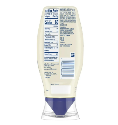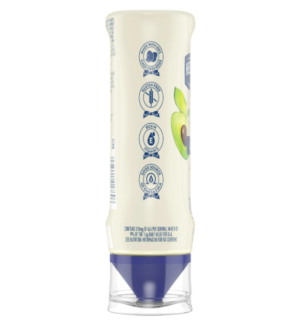 Hellmann's Avocado Oil Mayonnaise Dressing combines the creamy, rich taste you love with a blend of quality oils. Our mayonnaise dressing is made with the finest quality ingredients, including cage-free eggs, oils, and vinegar, ensuring a delicious and satisfying experience every time. This product is a good source of Omega 3 ALA, containing 310mg of ALA per serving, which is 19% of the 1.6g daily value for ALA. With 0g of trans fat per serving, it’s also rich in Vitamin E, gluten-free, and contains 30% less fat and calories than regular mayonnaise* (See Nutrition Information for Fat Content). This makes it an excellent choice for those looking to feel better about enjoying their meals. Hellmann's Avocado Oil Mayonnaise Dressing is perfect for spreading on sandwiches and wraps, grilling juicy burgers, and making bound salads. Its versatility ensures that it can elevate the taste of any dish it touches, bringing even the simplest ingredients together into something delicious. At Hellmann's, we believe that food is too good to be wasted. We’re dedicated to bringing out the best in pleasurable food moments, creating smiles around the table, and making every meal a moment of joy. Our brand is loved the world over for its commitment to quality and the simple pleasure of good food. *This product has 60 calories and 6g of fat per serving; mayonnaise has 90 calories and 10g of fat per serving.