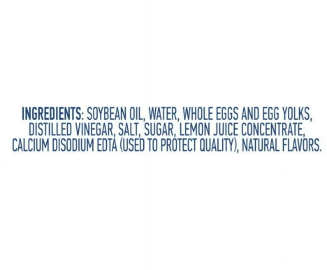 Soybean Oil, Water, Whole Eggs and Egg Yolks, Vinegar, Salt, Sugar, Lemon Juice Concentrate, Calcium Disodium EDTA (Used To Protect Quality), Natural Flavors.