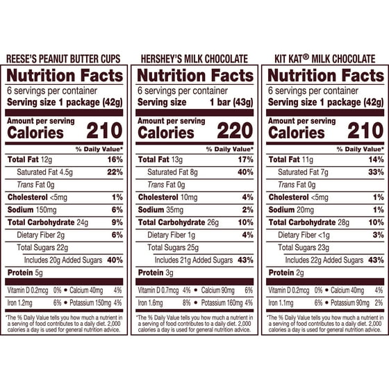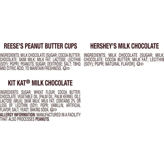 Reese's Peanut Butter Cups: Milk Chocolate (Sugar, Cocoa Butter, Chocolate, Skim Milk, Milk Fat, Lactose, Lecithin (Soy), PGPR), Peanuts, Sugar, Dextrose, Salt, TBHQ & Citric Acid (to Maintain Freshness). Hershey's Milk Chocolate: Milk Chocolate (Sugar, Milk, Chocolate, Cocoa Butter, Milk Fat, Lecithin (Soy), PGPR, Natural Flavor). Kit Kat Milk Chocolate: Sugar, Wheat Flour, Cocoa Butter, Chocolate, Vegetable Oil (Palm Oil, Palm Kernel Oil), Lactose (Milk), Skim Milk, Milk Fat, Contains 2% or Less of: Lecithin (Soy), PGPR, Vanillin (Artificial Flavor), Salt, Yeast, Baking Soda.
