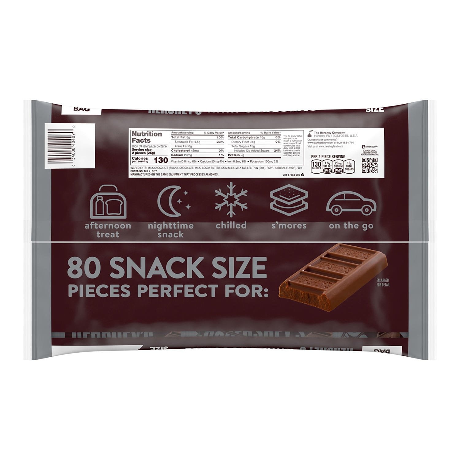 Made from delectable, creamy milk chocolate that's been a classic for decades, HERSHEY'S milk chocolate bars make life more delicious whether they're enjoyed alone or shared with loved ones. These snack size candies are the perfect treat for countless special and everyday occasions. Going on a camping trip? Create everyone's favorite campfire snack — s'mores. Want to make the holiday season a tiny bit sweeter? Add HERSHEY'S snack size milk chocolate candy bars in all of your Christmas stockings. These sweet treats can also be used for Halloween trick or treat bags, Easter baskets and Valentine's Day party favors.