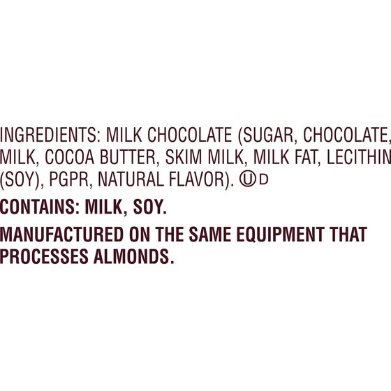 MILK CHOCOLATE (SUGAR, CHOCOLATE, MILK, COCOA BUTTER, SKIM MILK, MILK FAT, LECITHIN (SOY), PGPR, NATURAL FLAVOR).