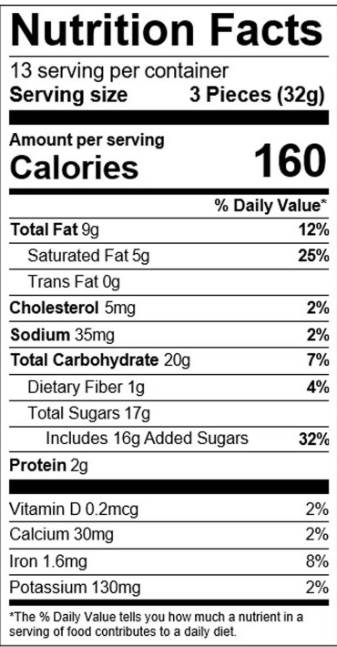 Ingredients: Semi Sweet Chocolate (Sugar, Unsweetened Chocolate, Cocoa Butter, Milkfat, Soy Lecithin, Vanillin), Milk Chocolate (Sugar, Cocoa Butter, Nonfat Dry Milk, Unsweetened Chocolate, Milkfat, Soy Lecithin, Vanillin), Sugar, High Fructose Corn Syrup, Palm Oil, Nonfat Milk, Cocoa Processed with Alkali, Sweet Whey, Water, Salted Butter (Pasteurized Cream, Salt), Coconut Oil, Unsweetened Chocolate, Glycerin, Mono and Diglycerides, Soy Lecithin, Microcrystalline Cellulose, Salt, Artificial Flavor, Disodium Phosphate Dihydrate, Natural Coffee Flavor, PGPR. Contains:Milk, Soy. May Contain: Almond, Pecan, Peanut, Egg.