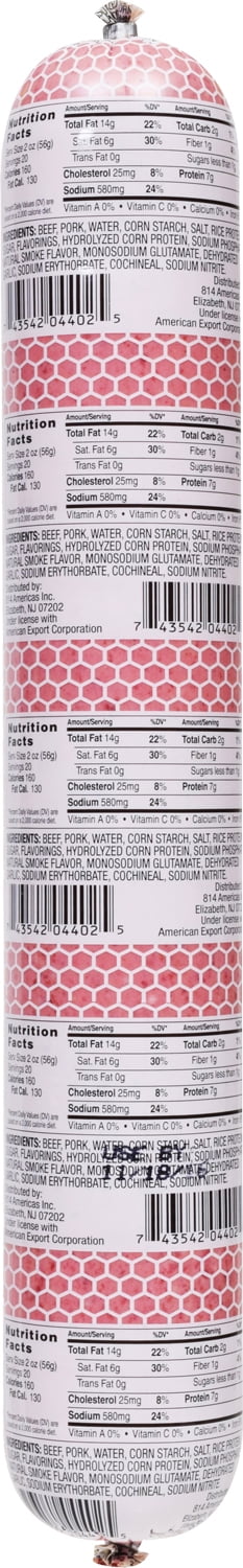 Beef, Pork, Water, Corn Starch, Salt, Rice Protein, Sugar, Flavorings, Hydrolyzed Corn Protein, Sodium Phosphate, Natural Smoked Flavor, Monosodium Glutamate, Dehydrated Garlic, Sodium Erythorbate, Cochineal, Sodium Nitrite.
