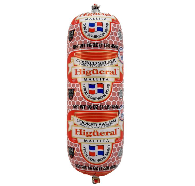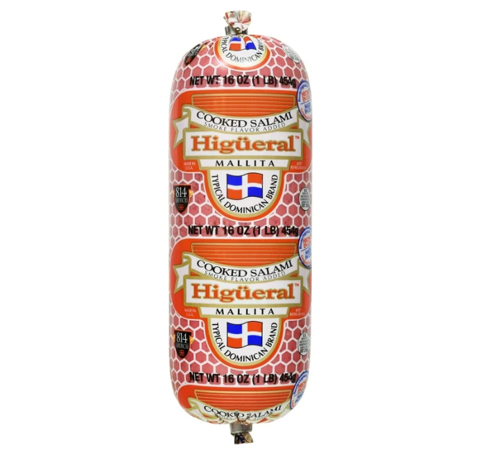 Higueral Mallita Cooked Salami, Smoke Flavor, is a popular Dominican brand known for its rich and savory taste. This 16 oz cooked salami is seasoned with traditional Dominican spices and enhanced with natural smoke flavor. It's made from a blend of beef and pork, along with ingredients like water, corn starch, salt, rice protein, sugar, and various flavorings. The salami is perfect for adding a flavorful touch to sandwiches, salads, and other dishes.