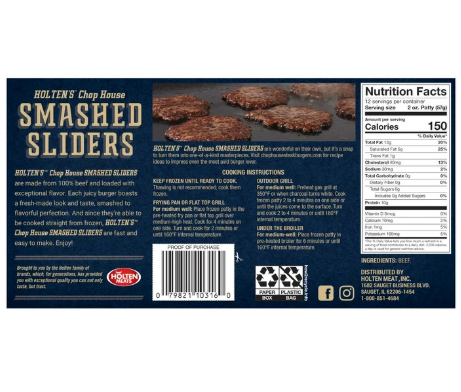 Holten’s Chop House Smashed Sliders are delicious, all-natural, 100% beef burgers designed to go from your freezer to flat top, grill, or skillet for perfectly juicy and flavorful sliders every time. With a fast cooking time and convenient size that fits slider buns, you can enjoy restaurant-style sliders for any occasion. Everyone loves a flavorful smashed slider burger with lettuce, tomatoes, onions, and pickles. So, bring the family, the neighbors, and friends and serve your sliders with grill master confidence! Each of our Smashed Sliders boasts a fresh made look and taste, smashed to flavorful perfection that will impress even the most avid burger lover. There are 12 - 2 ounce patties in each package. Keep Frozen. Gluten-Free. Enjoy! For recipe ideas, visit BeefItsWhatsForDinner.com