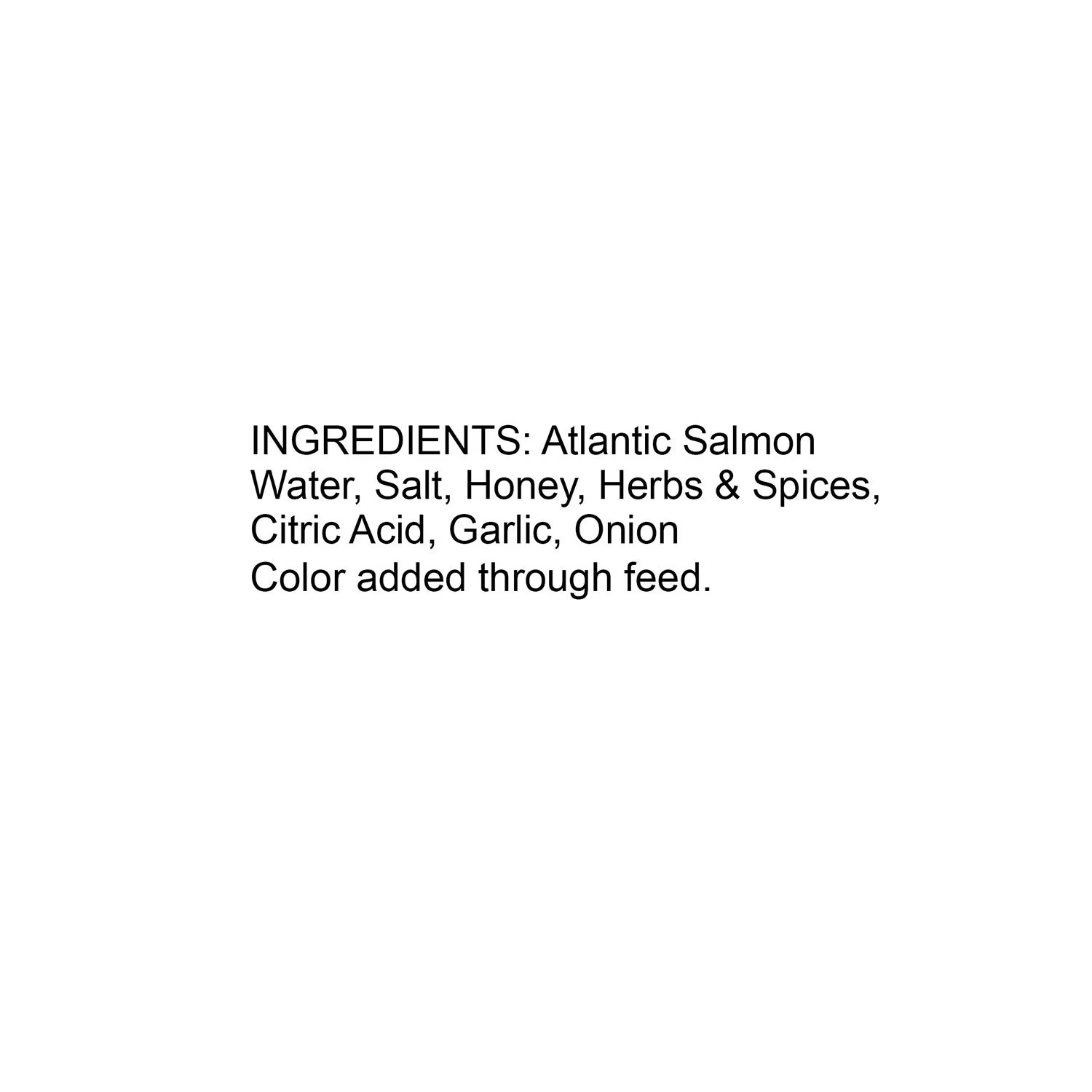 Ingredients: Atlantic salmon, water, salt, honey, herbs & spices, citric acid, garlic, onion, color added through feed.