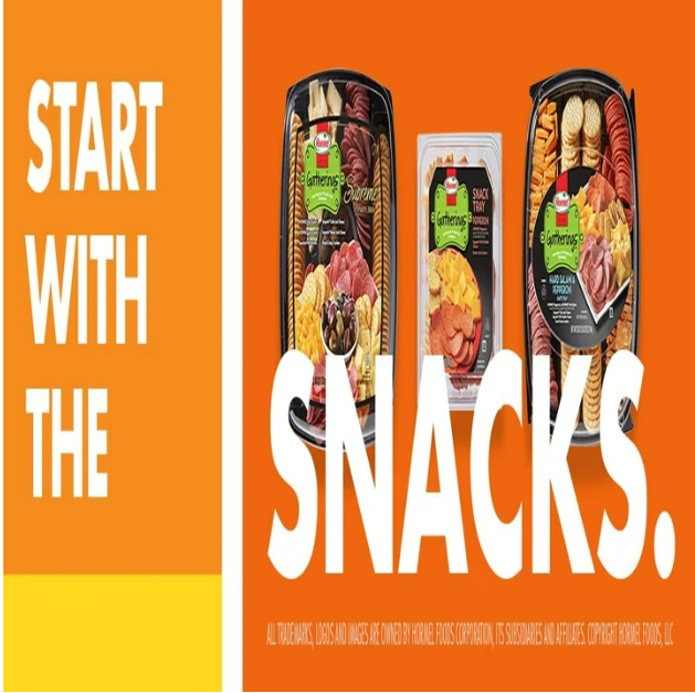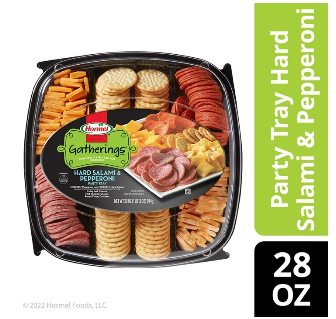 Includes one 28 oz plastic tray of HORMEL GATHERINGS Salami and Pepperoni with Cheese and Crackers