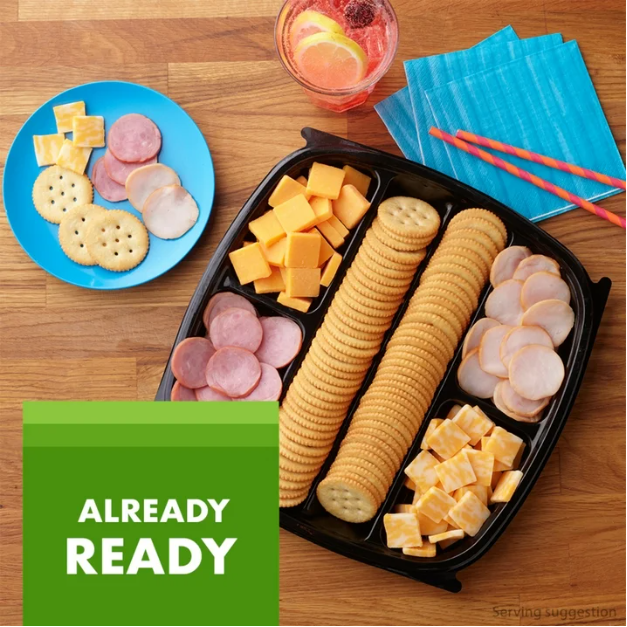 Includes slices of honey ham, smoked turkey, cheddar and colby-jack cheese and crackers, individually wrapped for freshness