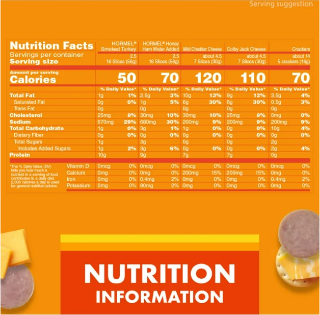 Hormel Smoked Turkey: (Turkey Breast, Turkey Broth, Salt, Sugar, Modified Food Starch, Sodium Phosphate, Sodium Ascorbate, Sodium Nitrite, Natural Flavoring). Hormel Honey Ham Water Added: (Cured with Water, Honey, Salt, Dehydrated Pork Stock [Dehydrated Pork Stock, Natural Flavors], Dextrose, Sodium Phosphates, Sodium Erythorbate, Sodium Nitrite). Mild Cheddar Cheese: (Cheddar Cheese [Pasteurized Milk, Cheese Culture, Salt, Enzymes, Annatto {Vegetable Color}], Potato Starch and Powdered Cellulose (to Prevent Caking), Natamycin [Mold Inhibitor]). Colby Jack Cheese: (Colby-Jack Cheese [Pasteurized Milk, Cheese Culture, Salt, Enzymes, Annatto (Vegetable Color)], Potato Starch [to Prevent Caking], Powdered Cellulose [to Prevent Caking], Natamycin [Mold Inhibitor]). Crackers: (Enriched Flour [Wheat Flour, Niacin, Reduced Iron, Thiamine Mononitrate, Riboflavin, Folic Acid], Vegetable Oil [Soybean Oil, TBHQ {Preservative}, Citric Acid {Preservative}], Vegetable Shortening [Canola Oil, Fractionated Palm Oil, TBHQ {Preservative}, Citric Acid {Preservative}], Sugar, Salt, Contains Less than 2% of Each of the Following: High Fructose Corn Syrup, Ammonium Bicarbonate, Monocalcium Phosphate, Baking Soda, Soy Lecithin, Artificial Flavor, Acacia [Gum Arabic], Papain, Enzymes).