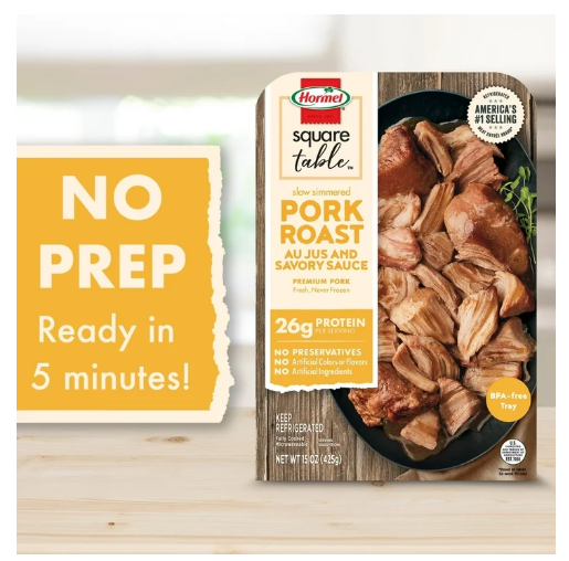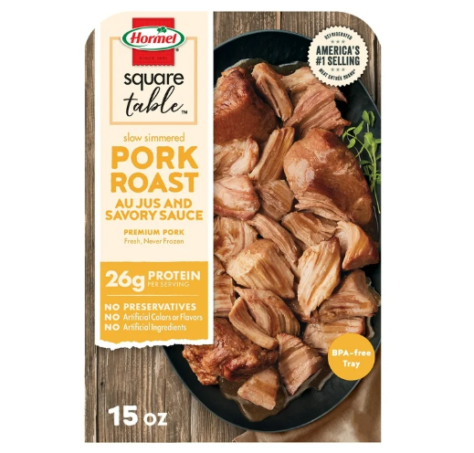 Includes one 15 oz Plastic Microwaveable Tray of refrigerated HORMEL SQUARE TABLE Slow Simmered Pork Au Jus & Savory Sauce