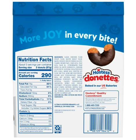 Sugar, Enriched Flour (Wheat Flour, Malted Barley Flour, Niacin, Reduced Iron Or Ferrous Sulfate, Thiamin Mononitrate, Riboflavin, Folic Acid), Palm Oil, Hydrogenated Palm Kernel Oil, Water, Soybean Oil, Contains 2% Or Less Of: Glycerin, Cocoa Processed With Alkali, Nonfat Milk, Defatted Soy Flour, Egg Yolk, Mono And Diglycerides, Sodium Acid Pyrophosphate, Baking Soda, Soy Lecithin, Whey, Sodium Aluminum Phosphate, Natural And Artificial Flavors, Preservatives (Natamycin, Sorbic Acid, Sodium Propionate, Potassium Sorbate), Salt, Wheat Starch, Dextrose, Dextrin, Guar Gum, Cellulose Gum, Enzymes, Annatto And Turmeric, Karaya Gum, Citric Acid, Yellow 6 Aluminum Lake.