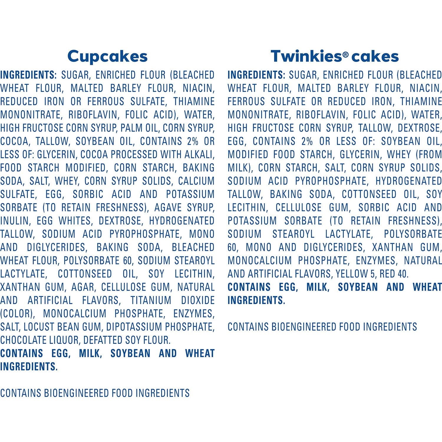 Chocolate Cupcake Ingredients: Sugar, Water, Enriched Flour (Bleached Wheat Flour, Malted Barley Flour, Niacin, Ferrous Sulfate Or Reduced Iron, Thiamine Mononitrate, Riboflavin, Folic Acid), High Fructose Corn Syrup, Palm Oil, Corn Syrup, Cocoa, Soybean Oil, Tallow, Contains 2% Or Less: Glycerin, Cocoa Processed With Alkali, Modified Cornstarch, Baking Soda, Salt, Corn Starch, Dextrose, Whey, Hydrogenated Tallow, Inulin, Egg, Calcium Carbonate, Sorbic Acid And Potassium Sorbate (To Retain Freshness), Calcium Sulfate, Enzymes, Egg White, Mono And Diglycerides, Sodium Acid Pyrophosphate, Cottonseed Oil, Natural And Artificial Flavor, Sodium Stearoyl Lactylate, Agar, Xanthan Gum, Soy Lecithin, Polysorbate 60, Cellulose Gum, Locust Bean Gum, Monocalcium Phosphate, Titanium Dioxide (Color), Disodium Phosphate, Sunflower Oil, Chocolate Liquor, Defatted Soy Flour. Allergy Information: contains egg, milk, soy, wheat.
