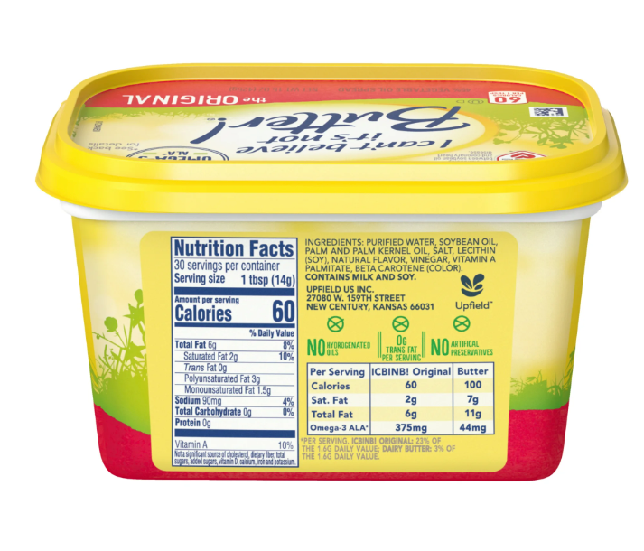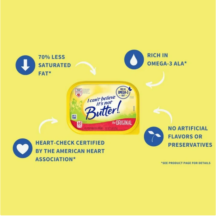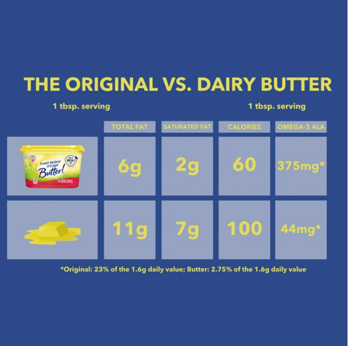 - 60 calories per 1 tablespoon serving and 70% less saturated fat than butter***