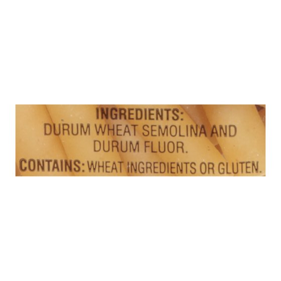 Durum Wheat Semolina, Durum Flour, Nicotinamide, Ferrous Sulfate (Iron), Thiamin Mononitrate, Riboflavin, Folic Acid. Contains Wheat Ingredients Or Gluten.