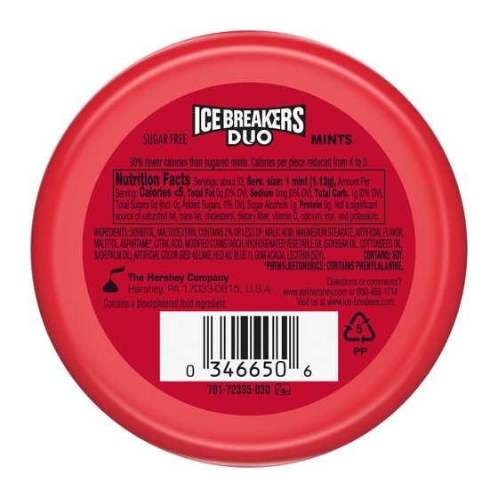 Sorbitol, Maltodextrin, Contains 2% or Less of: Malic Acid, Magnesium Stearate, Artificial Flavor, Maltitol, Aspartame *, Citric Acid, Modified Cornstarch, Hydrogenated Vegetable Oil (Soybean Oil, Cottonseed Oil, &/or Palm Oil), Artificial Color (Red 40 Lake, Red 40, Blue 1), Gum Acacia, Lecithin (Soy), * Phenylketonurics: Contains Phenylalanine.