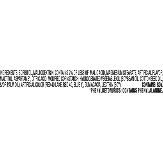 SORBITOL, MALTODEXTRIN, CONTAINS 2% OR LESS OF: MALIC ACID, MAGNESIUM STEARATE, ARTIFICIAL FLAVOR, MALTITOL, ASPARTAME*, CITRIC ACID, MODIFIED CORNSTARCH, HYDROGENATED VEGETABLE OIL (SOYBEAN OIL, COTTONSEED OIL, &/OR PALM OIL), ARTIFICIAL COLOR (RED 40 LAKE, RED 40, BLUE 1), GUM ACACIA, LECITHIN (SOY).