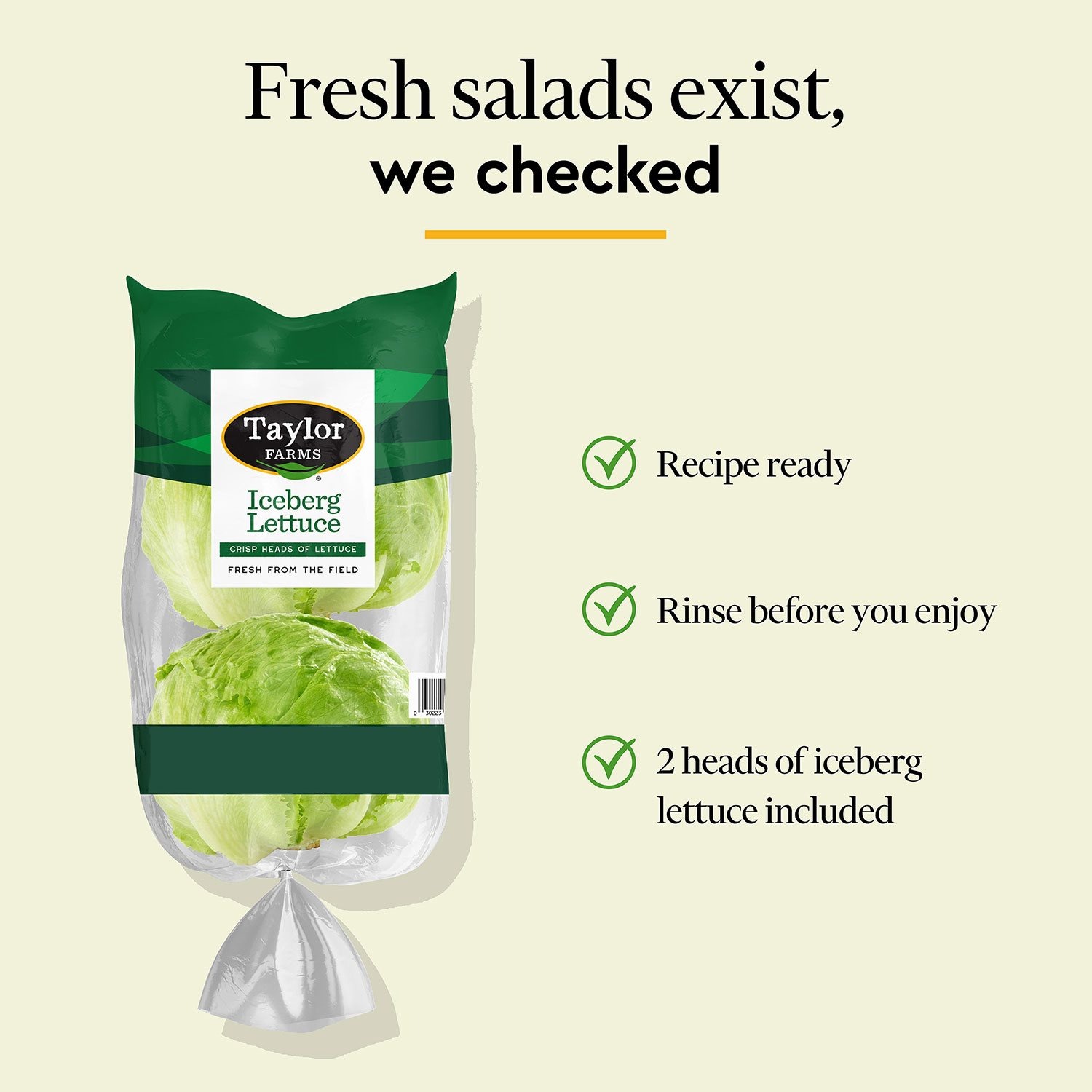Why settle for one when you can have two? Fill your refrigerator with Taylor Farms Iceberg lettuce and be ready for any meal. Perfect for topping sandwiches and burgers, chopping for crisp salads, shredding for tacos, or combining with cabbage slaw for coleslaw. This iceberg lettuce is sustainably grown, fat-free, and low in calories. Each package comes with two heads of lettuce. As this lettuce is packed at the field, rinsing before use is recommended.