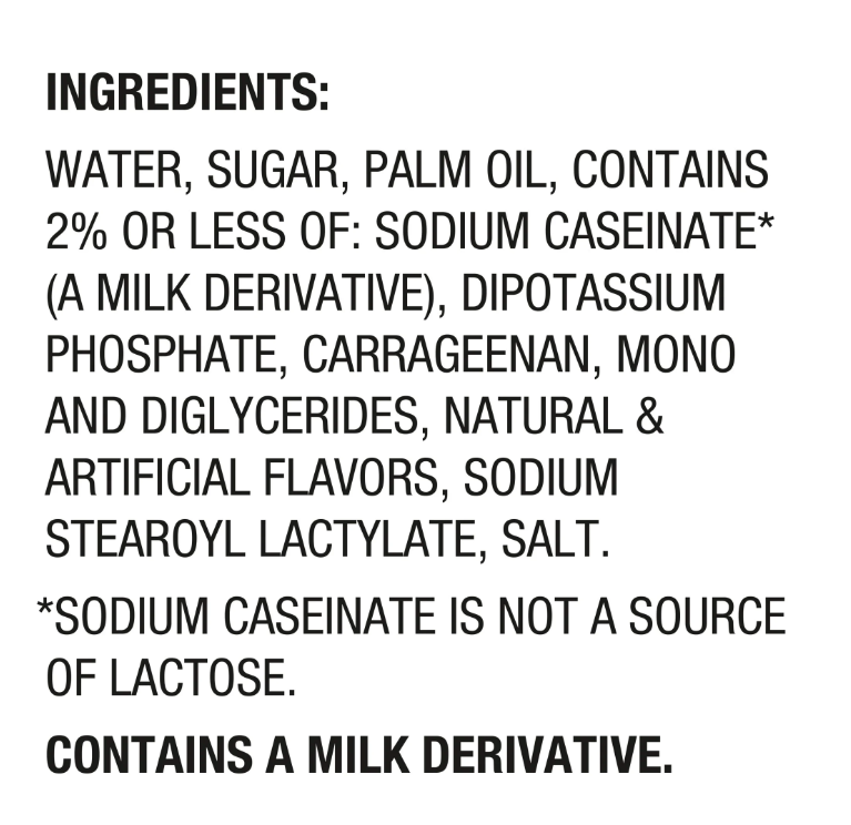 INGREDIENTS: WATER; SUGAR; PALM OIL; CONTAINS 2% OR LESS OF: SODIUM CASEINATE* (A MILK DERIVATIVE); DIPOTASSIUM PHOSPHATÉ; CARRAGEENAN; MONO AND DIGLYCERIDES; NATURAL & ARTIFICIAL FLAVORS; SODIUM STEAROYL LACTYLATE; SALT.*SODIUM CASEINATE IS NOT A SOURCE OF LACTOSE.