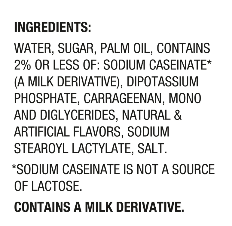 INGREDIENTS: WATER; SUGAR; PALM OIL; CONTAINS 2% OR LESS OF: SODIUM CASEINATE* (A MILK DERIVATIVE); DIPOTASSIUM PHOSPHATÉ; CARRAGEENAN; MONO AND DIGLYCERIDES; NATURAL & ARTIFICIAL FLAVORS; SODIUM STEAROYL LACTYLATE; SALT.*SODIUM CASEINATE IS NOT A SOURCE OF LACXTOSE.