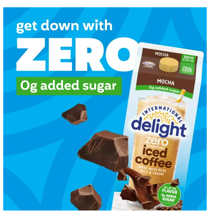 It's a full-on flavor party with every glass of International Delight Zero Mocha 0g Added Sugar Iced Coffee. This iced coffee drink is full of perfectly brewed coffee-ness and mocha flavored creaminess with 75 percent less sugar than our regular iced coffee. International Delight Iced Coffee Beverages with 0g added sugar* are made with real milk and cream for a flavor that’s pure delight. Sip on smooth mocha magic when you pour out instant fun with this iced coffee drink. No waiting. Just coffee. Plus, you can add your favorite International Delight Creamers to perfect your coffee break. With International Delight Zero Mocha 0g Added Sugar Iced Coffee, there’s always a good excuse for a flavorful celebration. We Like How You Party. *Not a low calorie food.