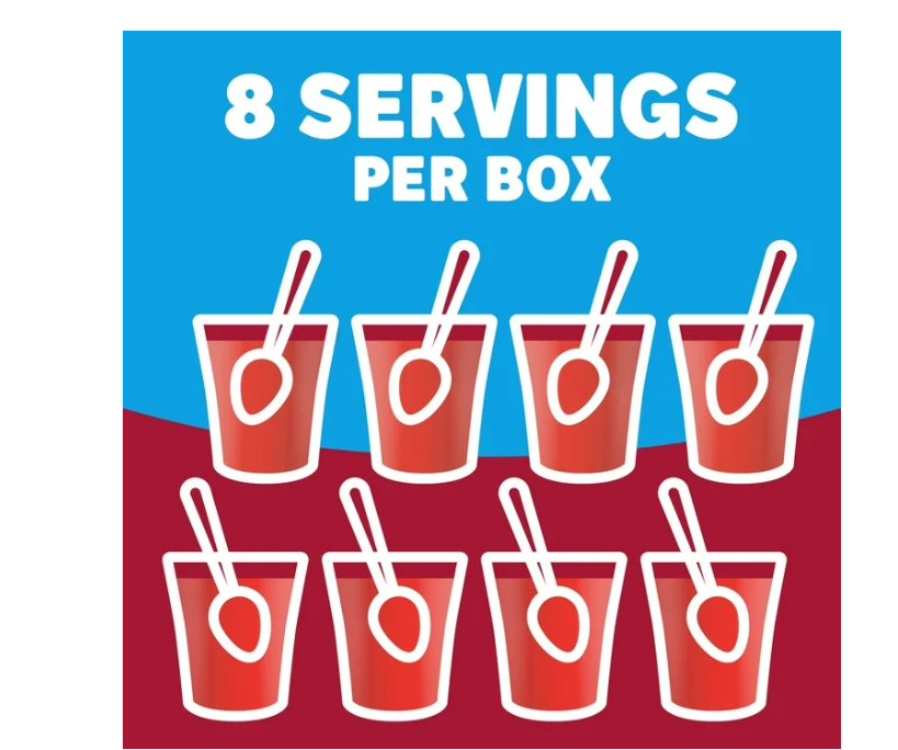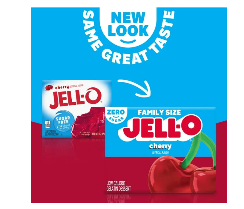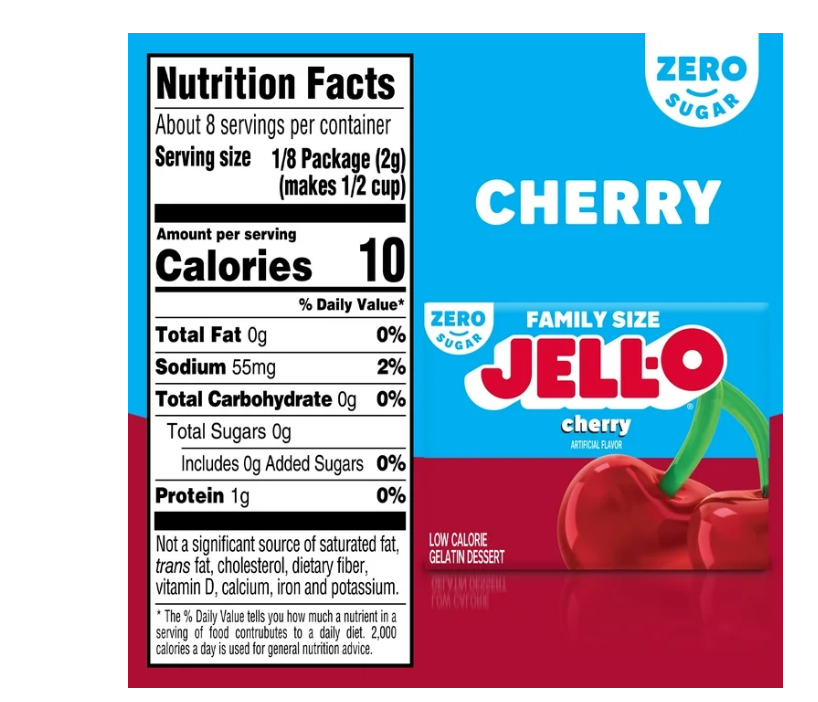 Snack happy. Jell-O Cherry Artificially Flavored Zero Sugar Low Calorie Gelatin Dessert Mix lets you add some wonder to your day with a fun snack. Spoon up a smile with our zero sugar artificially flavored cherry Jell-O gelatin that is delicious and contains 10 calories per serving. Our colorful, jiggly treat is perfect for everyday snacking or special occasions with family and friends. Additionally, our gelatin dessert mix is a versatile ingredient for creating delicious desserts like poke cakes, parfaits, pretzel salads, rainbow layer cakes and more. Our artificially flavored cherry gelatin dessert is easy to prepare. Simply add 2 cups boiling water to the gelatin mix, stir for 2 minutes until completely dissolved, stir in 2 cups cold water, then refrigerate for 4 hours or until firm. Each family size Jell-O zero sugar gelatin dessert mix is individually packaged in a 0.6-ounce sealed pouch and makes 8, 1/2-cup servings.