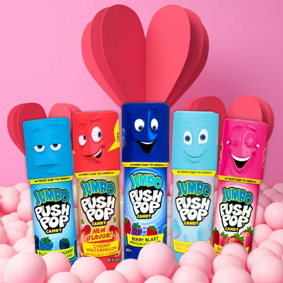 PUSH POP BERRY BLAST: SUGAR, GLUCOSE SYRUP, BUFFERED LACTIC ACID, ARTIFICIAL FLAVOR, BLUE 1, YELLOW 5. PUSH POP BLUE RASPBERRY: SUGAR, GLUCOSE SYRUP, BUFFERED LACTIC ACID, ARTIFICIAL FLAVOR, BLUE 1. PUSH POP WATERMELON: SUGAR, GLUCOSE SYRUP, BUFFERED LACTIC ACID, ARTIFICIAL FLAVOR, YELLOW 5, BLUE 1. PUSH POP STRAWBERRY: SUGAR, GLUCOSE SYRUP, BUFFERED LACTIC ACID, NATURAL & ARTIFICIAL FLAVORS, RED 40.