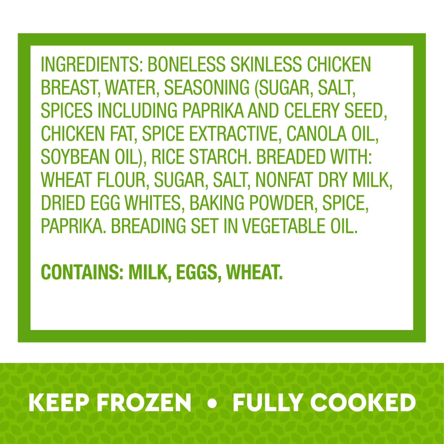 Ingredients: Boneless Skinless Chicken Breast, Water, Seasoning (Sugar, Salt, Spices Including Paprika And Celery Seed, Chicken Fat, Spice Extractive, Canola Oil, Soybean Oil), Rice Starch. Breaded With: Wheat Flour, Sugar, Salt, Nonfat Dry Milk, Dried Egg Whites, Baking Powder, Spice, Paprika. Breading Set In Vegetable Oil.