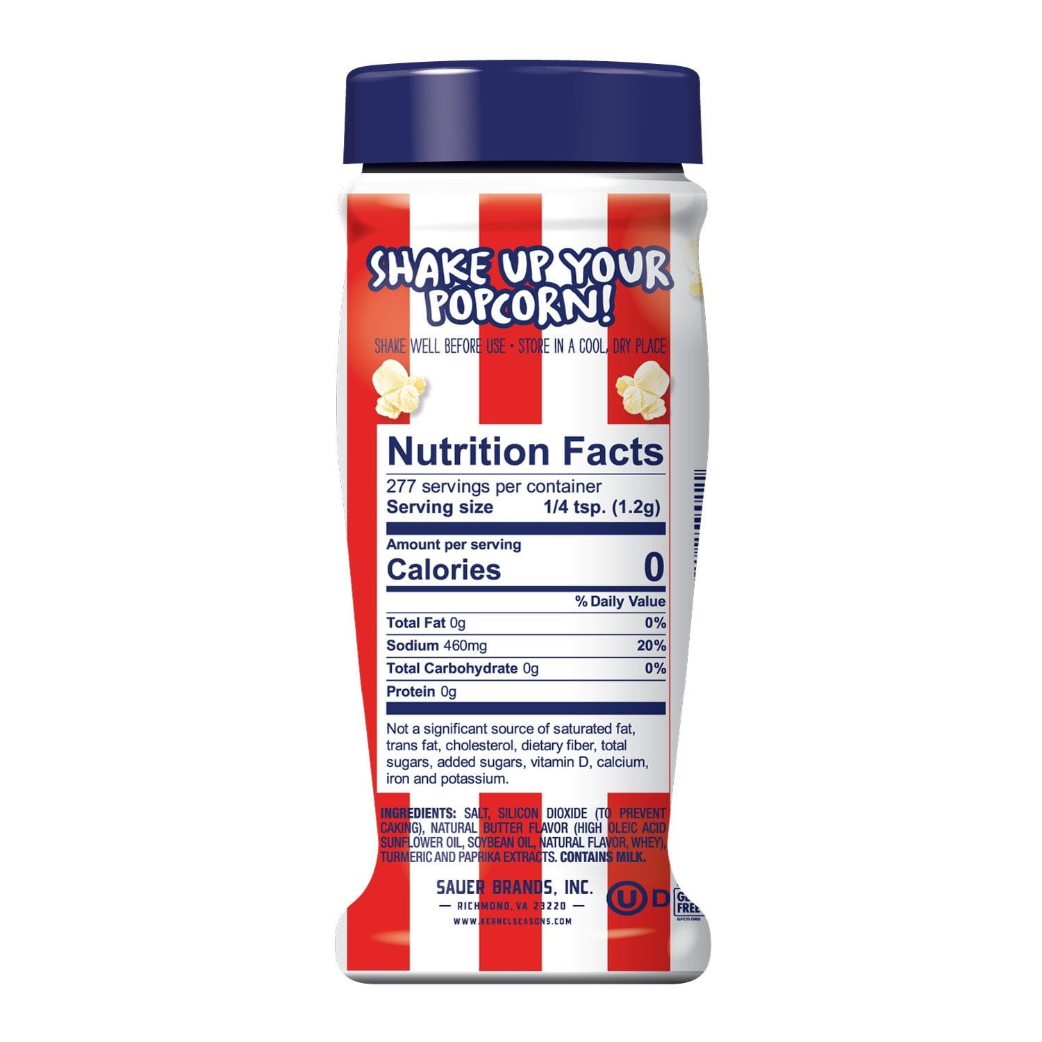 Ingredients: salt, silicon dioxide (to prevent caking), natural butter flavor (high oleic acid sunflower oil, soybean oil, natural flavor, whey), turmeric and paprika extracts.