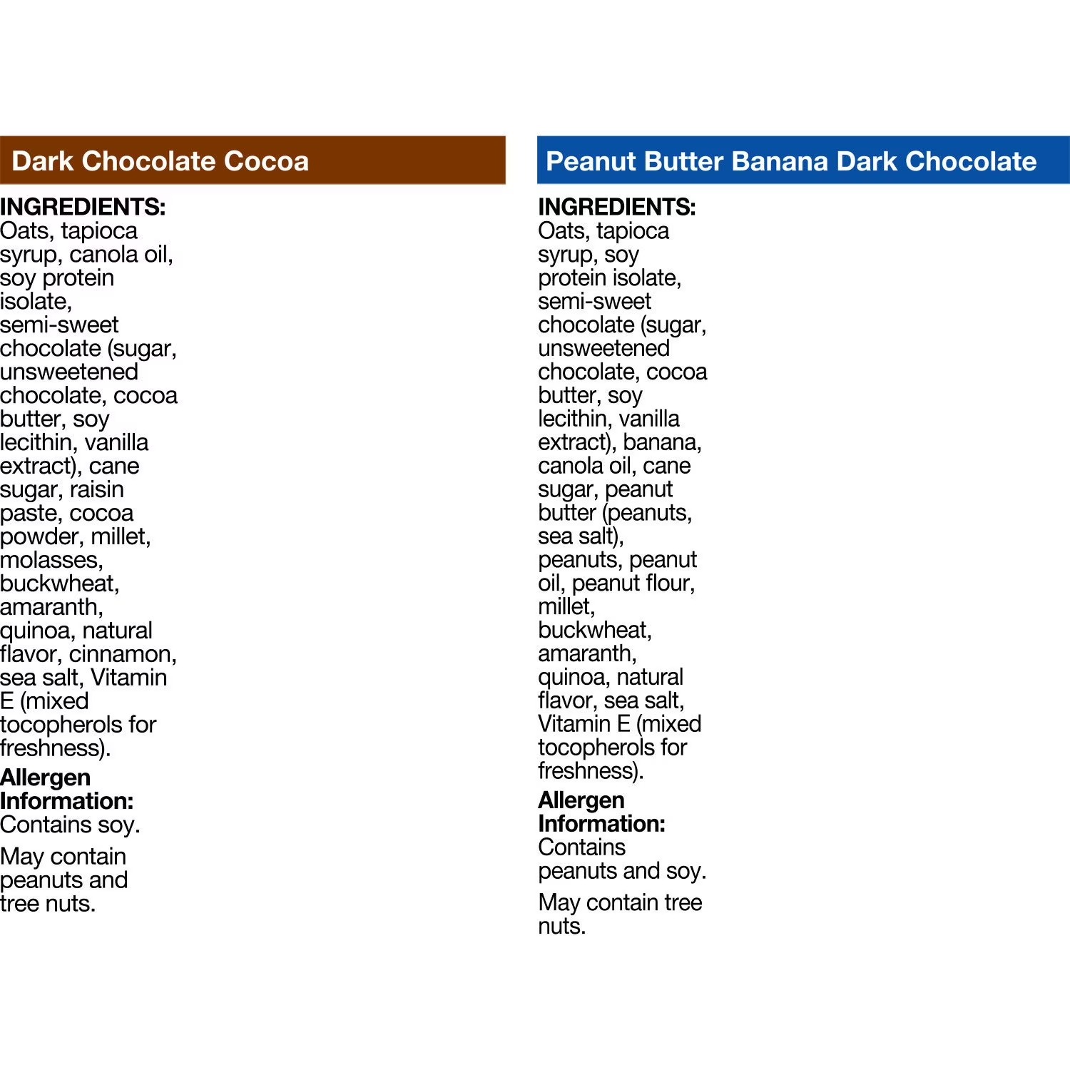 Peanut Butter Banana Dark Chocolate Ingredients: Oats, tapioca syrup, soy protein isolate, semi-sweet chocolate (sugar, unsweetened chocolate, cocoa butter, soy lecithin, vanilla extract), bananas, canola oil, cane sugar, peanut butter (peanuts, sea salt), peanuts, peanut oil, peanut flour, millet, buckwheat, amaranth, quinoa, natural flavor, sea salt, Vitamin E (tocopherols to maintain freshness). Contains peanuts and soy. May contain tree nuts.