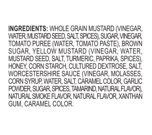 Whole Grain Mustard (Vinegar, Water, Mustard Seed, Salt, Spices), Sugar, Vinegar, Tomato Puree (Water, Tomato Paste), Brown Sugar, Yellow Mustard (Vinegar, Water, Mustard Seed, Salt, Turmeric, Paprika, Spices), Honey, Corn Starch, Cultured Dextrose, Salt, Worcestershire Sauce (Vinegar, Molasses, Corn Syrup, Water, Salt, Caramel Color, Garlic Powder, Sugar, Spices, Tamarind, Natural Flavor), Natural Smoke Flavor, Natural Flavor, Xanthan Gum, Caramel Color.