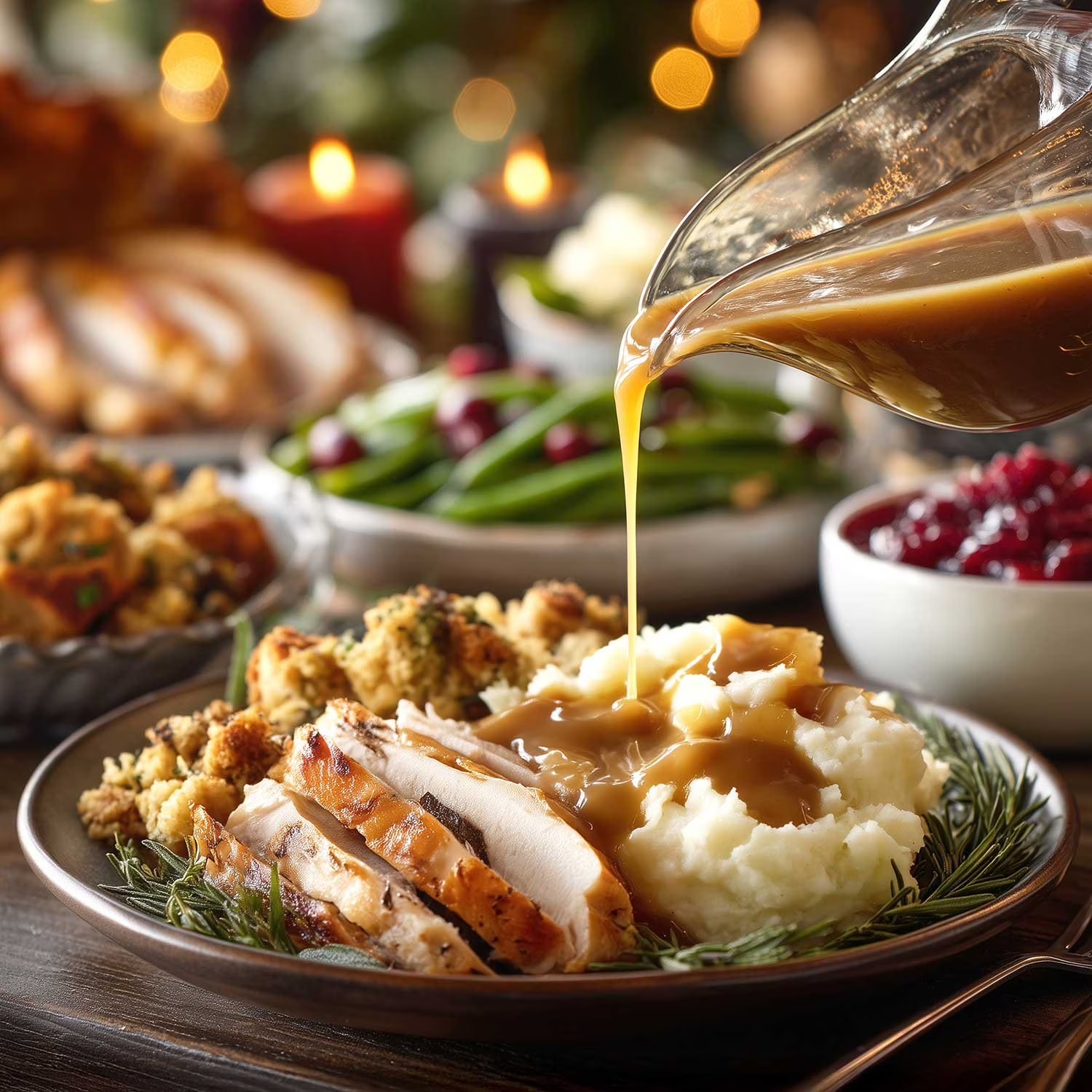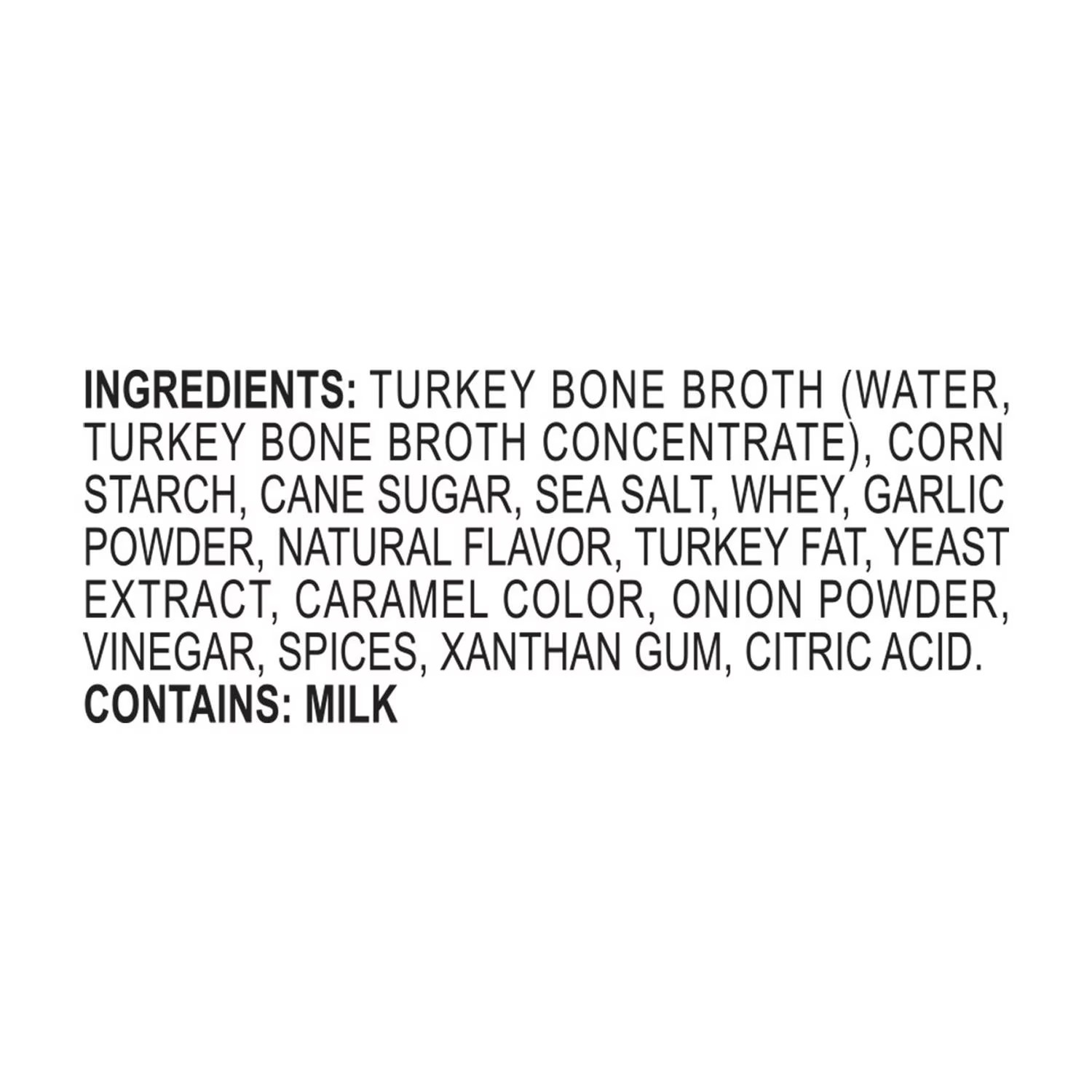 Ingredients: turkey bone broth (water, turkey bone broth concentrate), corn starch, cane sugar, sea salt, whey, garlic powder, natural flavor, turkey fat, yeast extract, caramel color, onion powder, vinegar, spices, xanthan gum, citric acid. Contains milk.