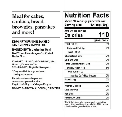 King Arthur Baking Company Non-GMO Project Verified, Certified Kosher Unbleached All Purpose Flour, 5 lb Bag is an essential ingredient for every baker. Our all-purpose flour works beautifully in any recipe calling for "flour" or "all purpose flour," yielding exceptional results every time. Unbleached and unbromated, this wheat flour is milled to be versatile—strong enough for bread and gentle enough for tender, delicate scones and cakes. Whether you're baking with bread flour, organic flour, or switching from self rising flour, this pantry staple delivers consistent performance. King Arthur flour is trusted by bakers for its quality, and tested to the strictest specifications in the industry so you can rely on it for all your cooking and baking needs.