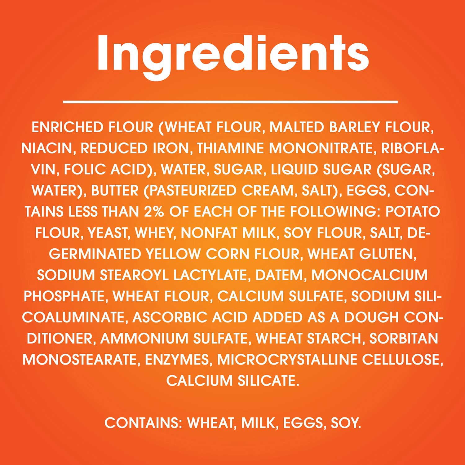 Ingredients: Enriched Flour (Wheat Flour, Malted Barley Flour, Niacin, Reduced Iron, Thiamine Mononitrate, Riboflavin, Folic Acid), Water, Sugar, Liquid Sugar (Sugar, Water), Butter (Pasteurized Cream, Salt), Eggs, Contains Less Than 2% Of Each Of The Following: Potato Flour, Yeast, Whey, Nonfat Milk, Soy Flour, Salt, De-germinated Yellow Corn Flour, Wheat Gluten, Sodium Stearoyl Lactylate, Datem, Monocalcium Phosphate, Wheat Flour, Calcium Sulfate, Sodium Silicoaluminate, Ascorbic Acid Added As A Dough Conditioner, Ammonium Sulfate, Wheat Starch, Sorbitan Monostearate, Enzymes, Microcrystalline Cellulose, Calcium Silicate.