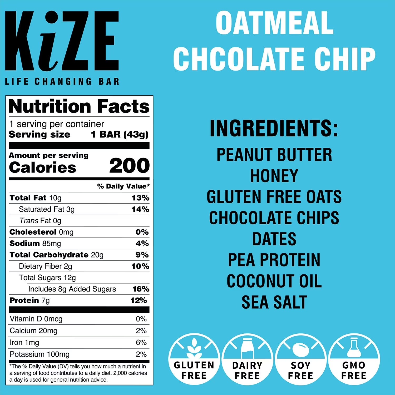 Oatmeal Chocolate Chip Ingredients: Peanut Butter (Peanuts), Honey, Gluten Free Oats, Chocolate Chips, Dates, Pea Protein, Coconut Oil, Sea Salt