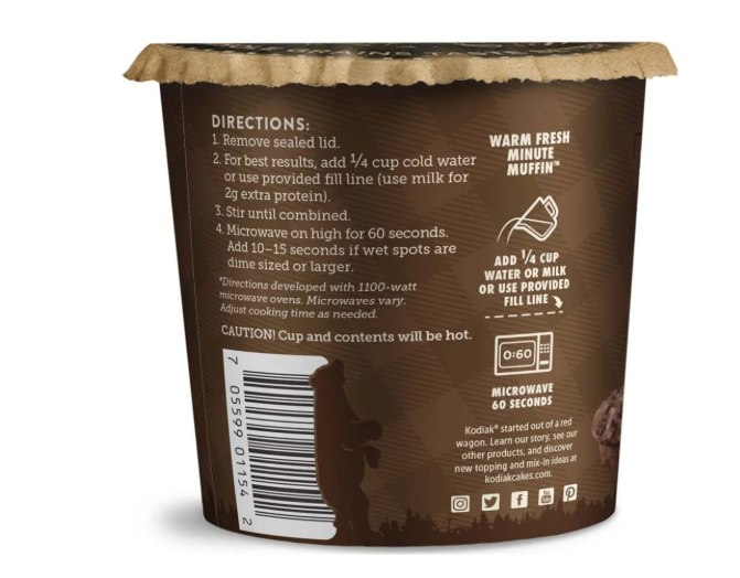 Warm fresh muffin in a minute.Add ¼ cup water or milk or use provided fill line.Microwave 60 seconds.1. Remove sealed lid.2. For best results, add 1/4 cup cold water, or use provided fill line. (Use milk for 2g extra protein).3. Stir until combined.4. Microwave on high for 60 seconds. Add 10-15 seconds if wet spots are dime sized or larger.