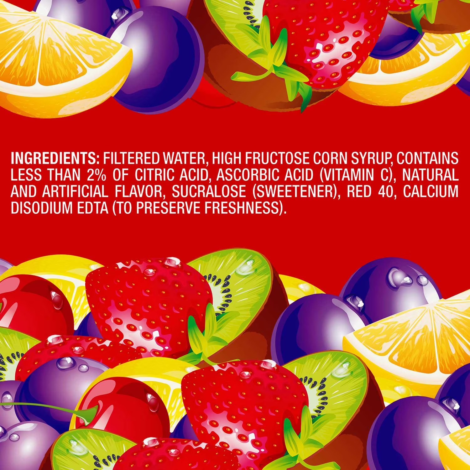 Ingredients Grape: (Filtered Water, High Fructose Corn Syrup, Contains Less Than 2% Of Citric Acid, Ascorbic Acid (Vitamin C), Natural And Artificial Flavor, Sucralose (Sweetener), Sodium Citrate, Red 40, Blue 1, Calcium Disodium Edta (To Preserve Freshness)).