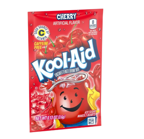 Kool-Aid Artificially Flavored Cherry Unsweetened Powdered Drink Mix is a delicious way to stay hydrated. This unsweetened powdered drink mix makes it easy to prepare a tasty red cherry drink. Just mix it with water and sugar or your sweetener of choice. Quench your thirst with the refreshingly sweet taste of cherry. With no caffeine, this artificially flavored powdered drink mix is always a great choice for the whole family. It's also a good source of vitamin C. These handy packets of unsweetened cherry drink ensure that you always have a refreshing beverage ready-to-go. To prepare, empty contents of the 0.13 ounce drink mix packet into a plastic or glass pitcher. Add 1 cup of sugar or sweetener. Then, just add ice and water and stir for a 2 quart supply of tasty cherry Kool-Aid. Gluten-Free.