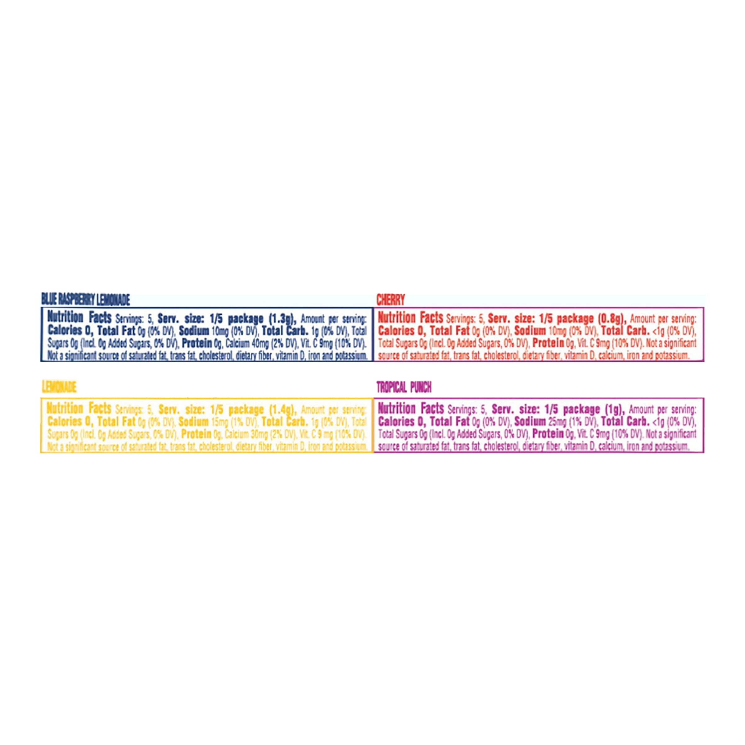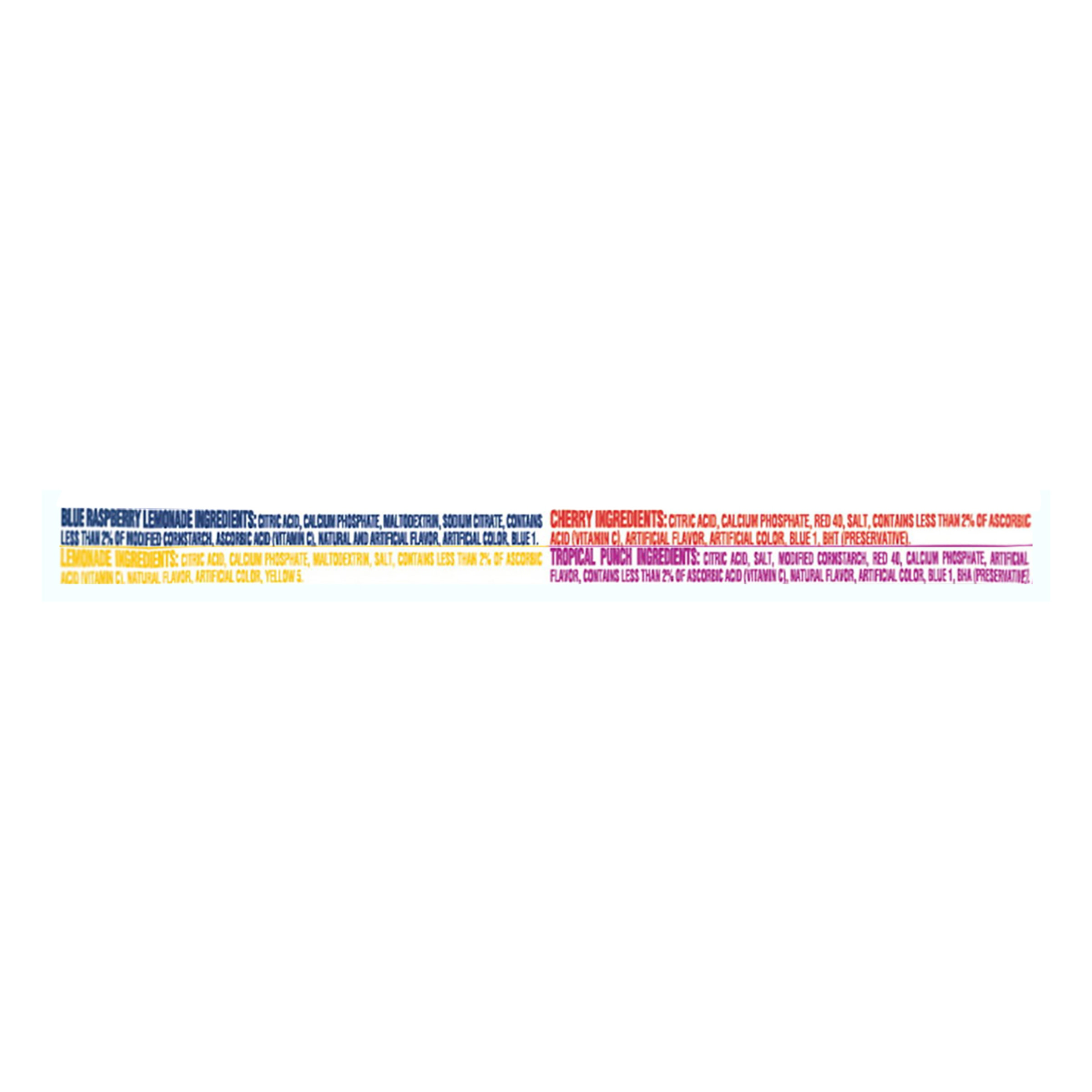 CHERRY CITRIC ACID, CALCIUM PHOSPHATE, RED 40, SALT, CONTAINS LESS THAN 2% OF ASCORBIC ACID (VITAMIN C), ARTIFICIAL FLAVOR, ARTIFICIAL COLOR, BLUE 1, BHT (PRESERVATIVE). TROPICAL PUNCH CITRIC ACID, SALT, MODIFIED CORNSTARCH, RED 40, CALCIUM PHOSPHATE, ARTIFICIAL FLAVOR, CONTAINS LESS THAN 2% OF ASCORBIC ACID (VITAMIN C), NATURAL FLAVOR, ARTIFICIAL COLOR, BLUE 1, BHA (PRESERVATIVE). LEMONADE CITRIC ACID, CALCIUM PHOSPHATE, MALTODEXTRIN, SALT, CONTAINS LESS THAN 2% OF ASCORBIC ACID (VITAMIN C), NATURAL FLAVOR, ARTIFICIAL COLOR, YELLOW 5. BLUE RASPBERRY LEMONADE CITRIC ACID, CALCIUM PHOSPHATE, MALTODEXTRIN, SODIUM CITRATE, CONTAINS LESS THAN 2% OF MODIFIED CORNSTARCH, ASCORBIC ACID (VITAMIN C), NATURAL AND ARTIFICIAL FLAVOR, ARTIFICIAL COLOR, BLUE 1.