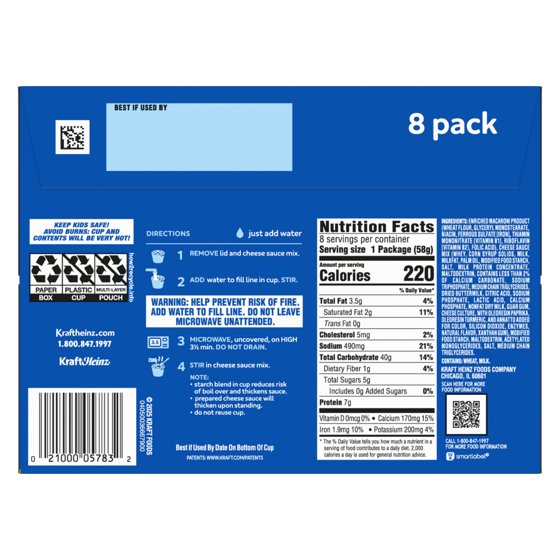 Enriched Macaroni Product (Wheat Flour, Glyceryl Monostearate, Niacin, Ferrous Sulfate [Iron], Thiamin Mononitrate [Vitamin B1], Riboflavin [Vitamin B2], Folic Acid), Cheese Sauce Mix (Whey, Corn Syrup Solids, Milk, Milkfat, Palm Oil, Modified Food Starch, Salt, Milk Protein Concentrate, Maltodextrin, Contains Less than 2% of Calcium Carbonate, Sodium Triphosphate, Medium Chain Triglycerides, Dried Buttermilk, Citric Acid, Sodium Phosphate, Lactic Acid, Calcium Phosphate, Nonfat Dry Milk, Guar Gum, Cheese Culture, with Paprika, Turmeric, and Annatto Added for Color, Silicon Dioxide, Enzymes, Natural Flavor, Xanthan Gum), Modified Food Starch, Maltodextrin, Acetylated Monoglycerides, Salt, Medium Chain Triglycerides.