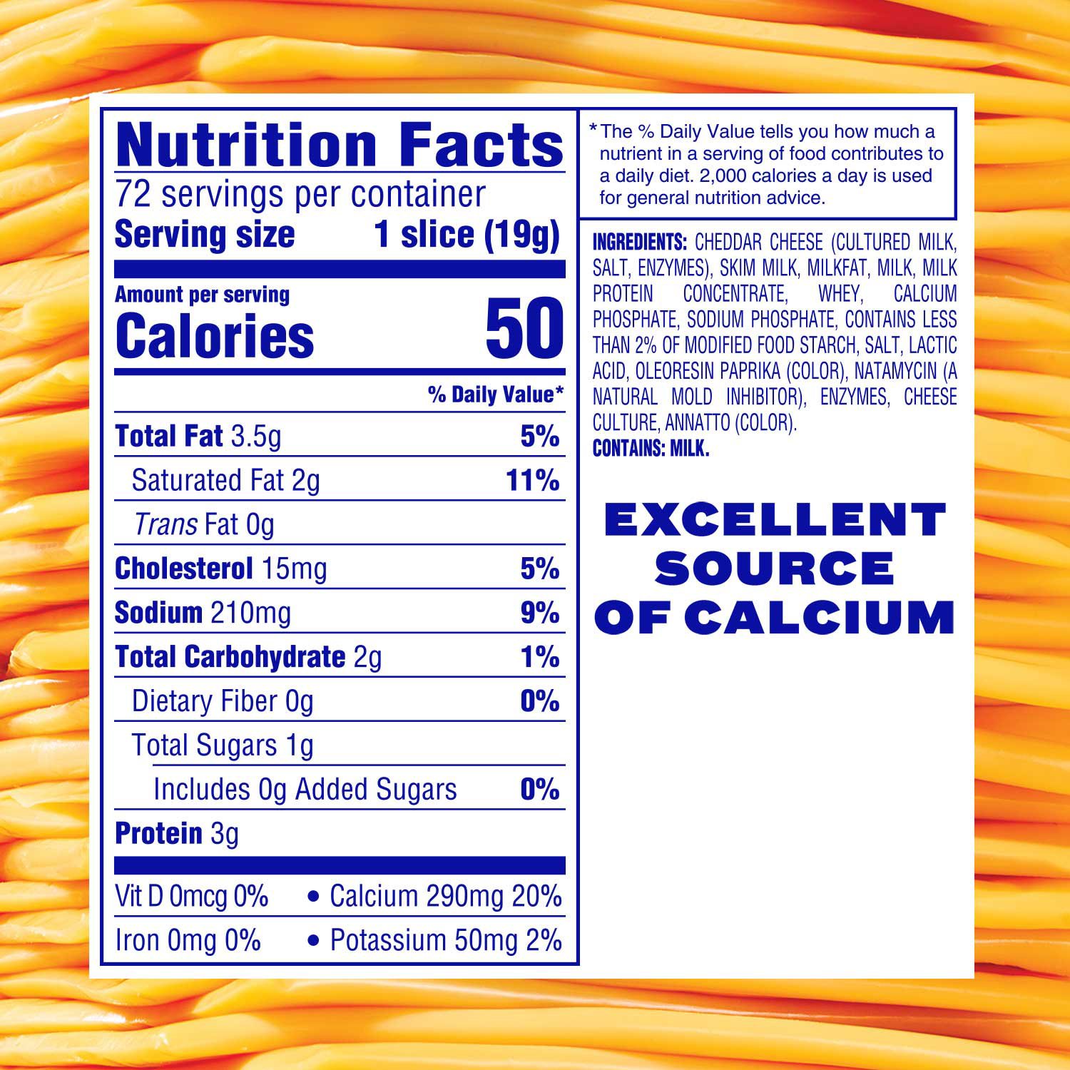 Cheddar Cheese (Cultured Milk, Salt, Enzymes), Skim Milk, Milkfat, Milk Protein Concentrate, Whey, Calcium Phosphate, Sodium Phosphate, Contains Less Than 2% of Modified Food Starch, Salt, Lactic Acid, Milk, Annatto And Paprika Extract (Color), Natamycin (A Natural Mold Inhibitor), Enzymes, Cheese Culture, Vitamin D3.