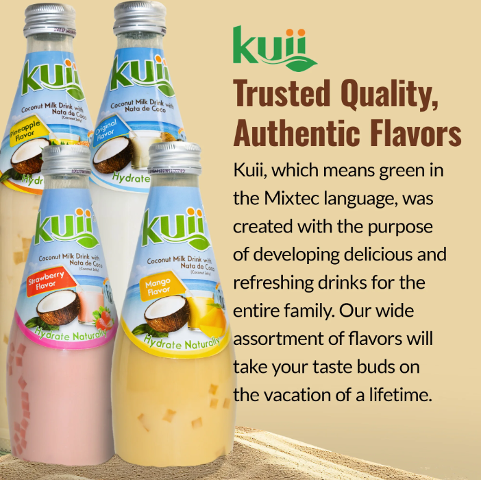 Indulge in the tropical taste of Kuii Coconut Milk Mango Flavor with coconut jelly cubes, available in a convenient 290ml shelf-stable bottle. This refreshing drink combines smooth coconut milk with the sweetness of ripe mango, delivering a burst of energy with every sip. Enriched with Vitamin E, antioxidants, and iron, it supports immune health, promotes digestion, and enhances overall wellness. Whether at home, at work, or on the go, Kuii Coconut Milk provides a delicious and nutritious way to stay refreshed throughout the day. Kuii, which means green in the Mixtec language, was created with the purpose of developing delicious and refreshing drinks for the entire family. Our wide assortment of flavors will take your taste buds on a vacation of a lifetime.