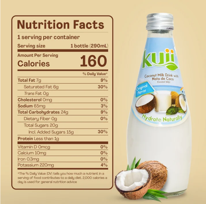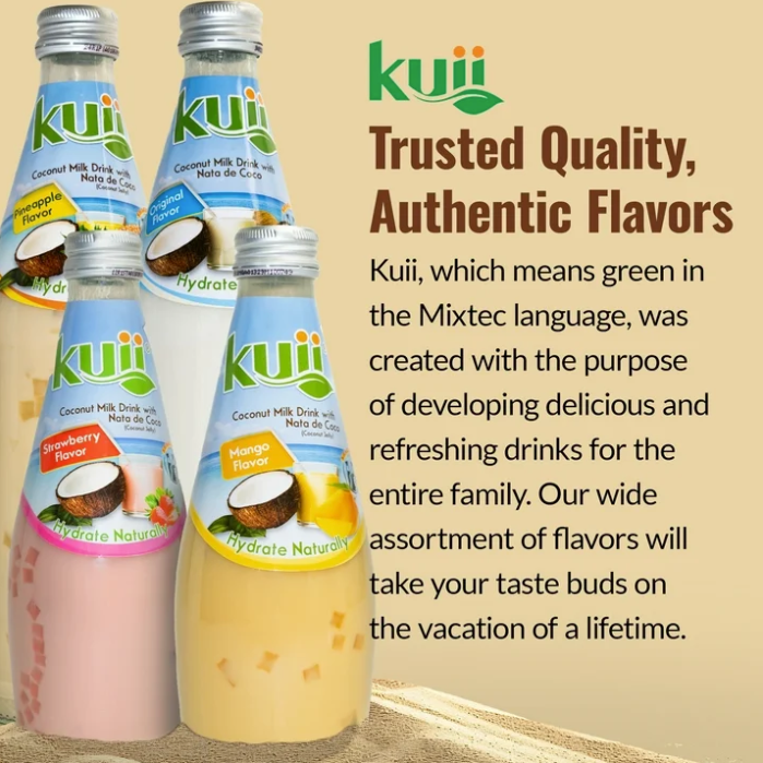 Enjoy the tropical taste of Kuii Coconut Milk Original Flavor with coconut jelly cubes, available in a convenient 290ml shelf-stable bottle. This smooth and creamy coconut milk provides a refreshing experience with every sip, perfect for home, work, or on-the-go hydration. Enriched with Vitamin E, antioxidants, and iron, this drink promotes healthy digestion, boosts energy, and enhances overall wellness. Whether you need a refreshing pick-me-up during the day or a nourishing beverage to support your active lifestyle, Kuii Coconut Milk delivers essential nutrients with delicious flavor. Kuii, which means green in the Mixtec language, was created with the purpose of developing delicious and refreshing drinks for the entire family. Our wide assortment of flavors will take your taste buds on a vacation of a lifetime.