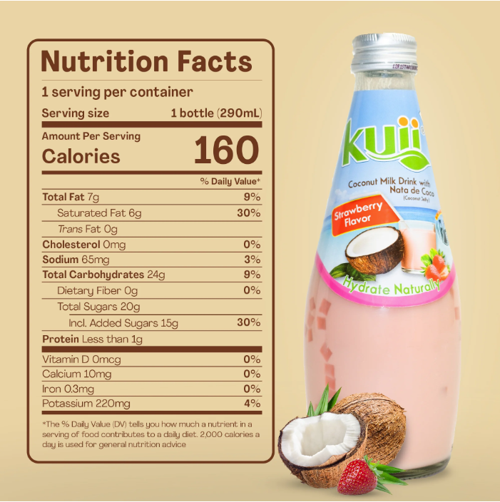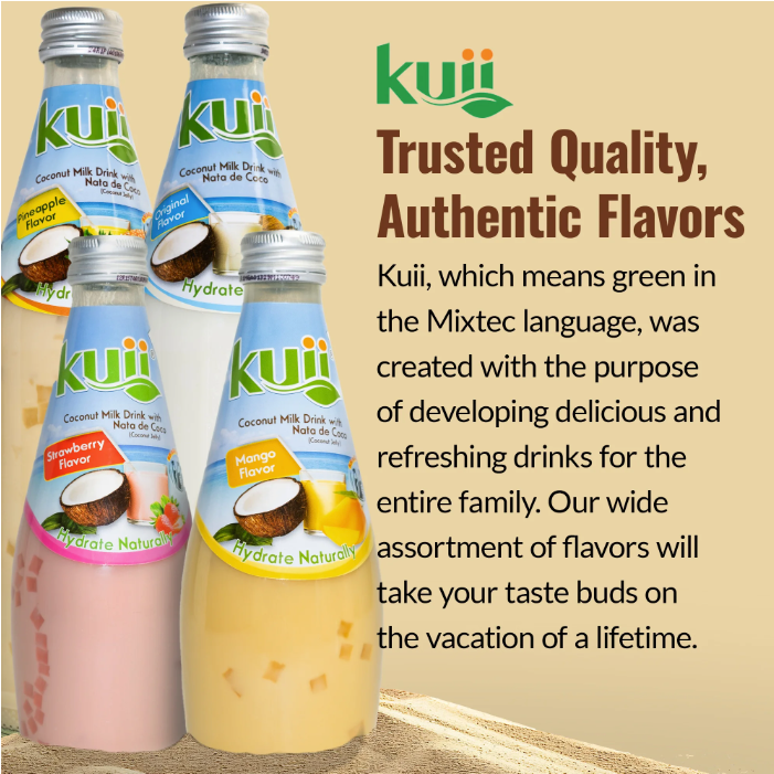 Savor the tropical taste of Kuii Coconut Milk Strawberry Flavor with coconut jelly cubes, offered in a convenient 290ml shelf-stable bottle. This refreshing drink blends smooth coconut milk with the sweetness of ripe strawberries, creating a flavorful and energizing experience with every sip. Packed with Vitamin E, antioxidants, and iron, it promotes healthy digestion, boosts energy, and enhances overall wellness. Whether enjoyed at home, at work, or on the go, Kuii Coconut Milk offers a delicious and nutritious way to stay refreshed throughout the day. Kuii, which means green in the Mixtec language, was created with the purpose of developing delicious and refreshing drinks for the entire family. Our wide assortment of flavors will take your taste buds on a vacation of a lifetime.
