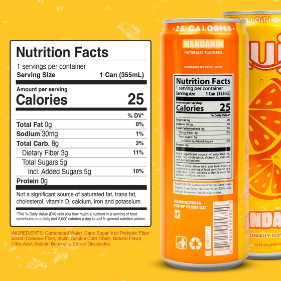 Carbonated Water, Cane Sugar, Kuii Prebiotic Fibler Blend (Cassava Fiber, Inulin, Soluble Corn Fiber), Natural Flavor, Citric Acid, Sodium Benzoate, Steviol Glycosides.