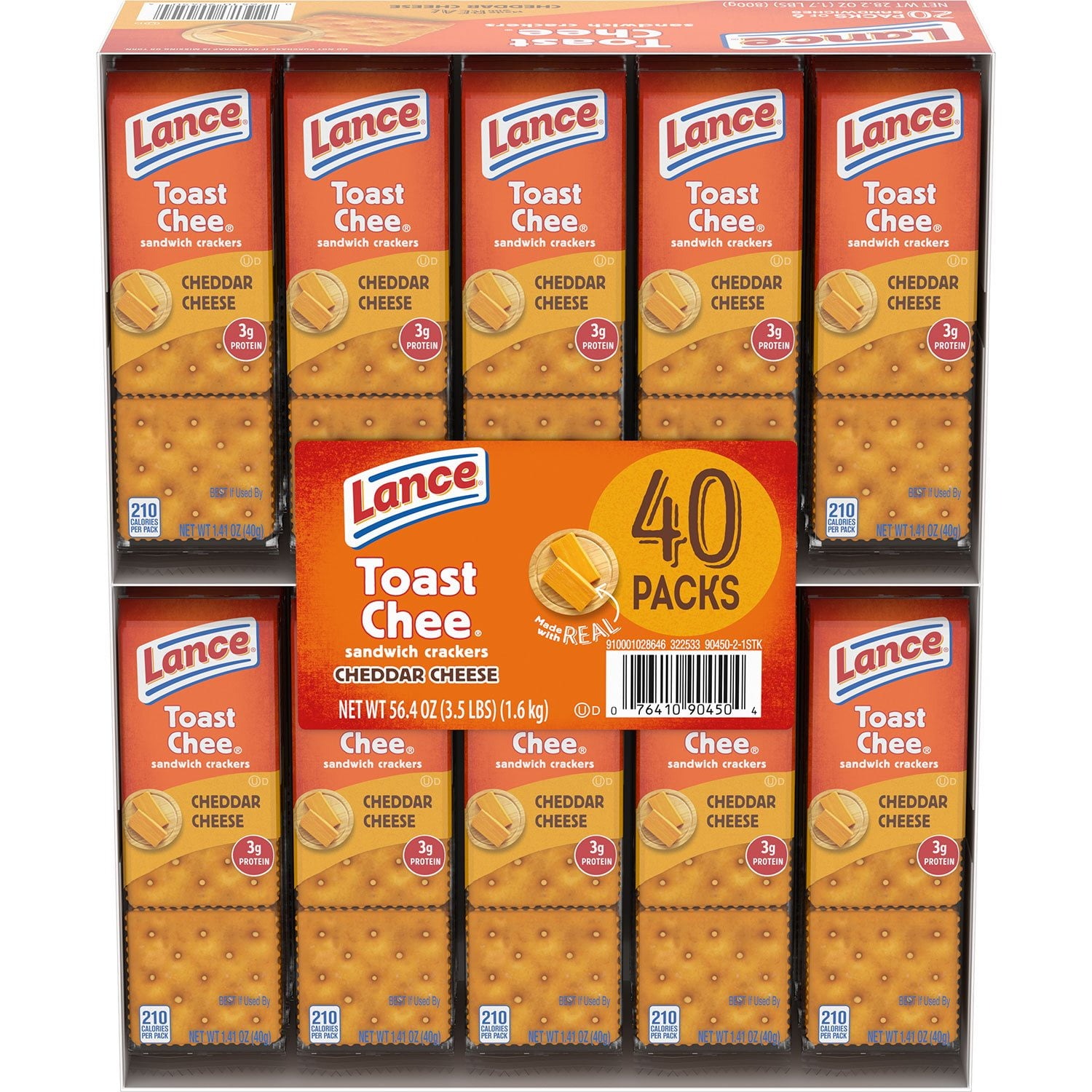 Lance ToastChee Cheddar Cheese 1.41 oz., 40 ct. snacks are conveniently packaged and individually wrapped. They are fresh, delicious and wholesome. These toastchee crackers are made with sharp cheddar cheese and are delicious with only 200 calories per six-snack cracker package.