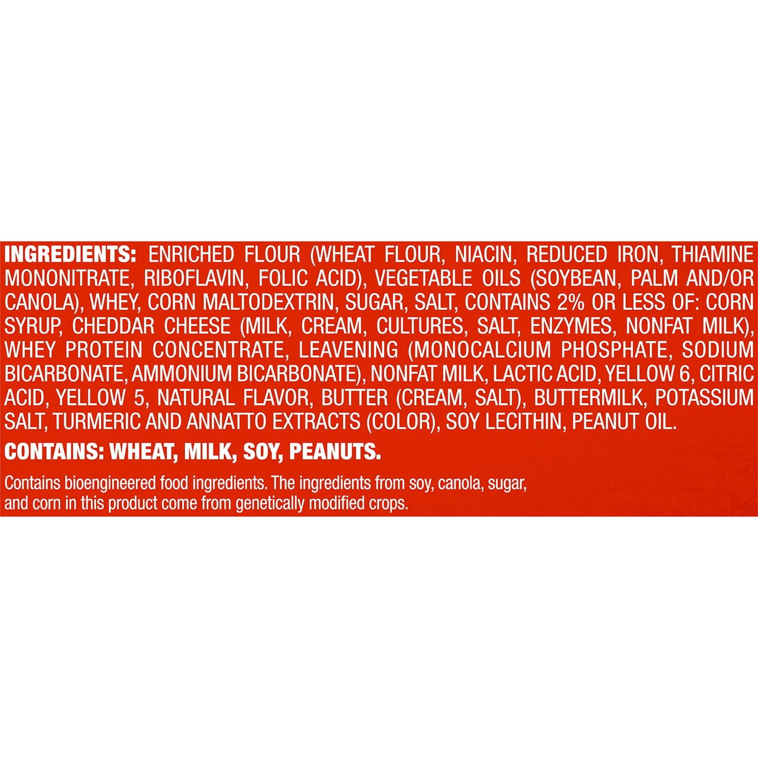 Ingredients: Enriched Flour (Wheat Flour, Niacin, Reduced Iron, Thiamine Mononitrate, Riboflavin, Folic Acid), Vegetable Oils (Palm, Soybean And/Or Canola), Whey, Corn Maltodextrin, Sugar, Salt, Corn Syrup, Cheddar Cheese (Milk, Cultures, Salt, Enzymes), Whey Protein Concentrate, Leavening (Monocalcium Phosphate, Sodium Bicarbonate, Ammonium Bicarbonate), Nonfat Milk, Lactic Acid, Yellow 6, Citric Acid, Yellow 5, Natural Flavor, Butter, Enzyme Modified Cheddar Cheese (Milk, Cultures, Salt, Enzymes), Buttermilk, Potassium Salt, Colors (Turmeric And Annatto Extracts), Soy Lecithin, Peanut Oil. Contains Wheat, Milk, Soy, Peanuts.