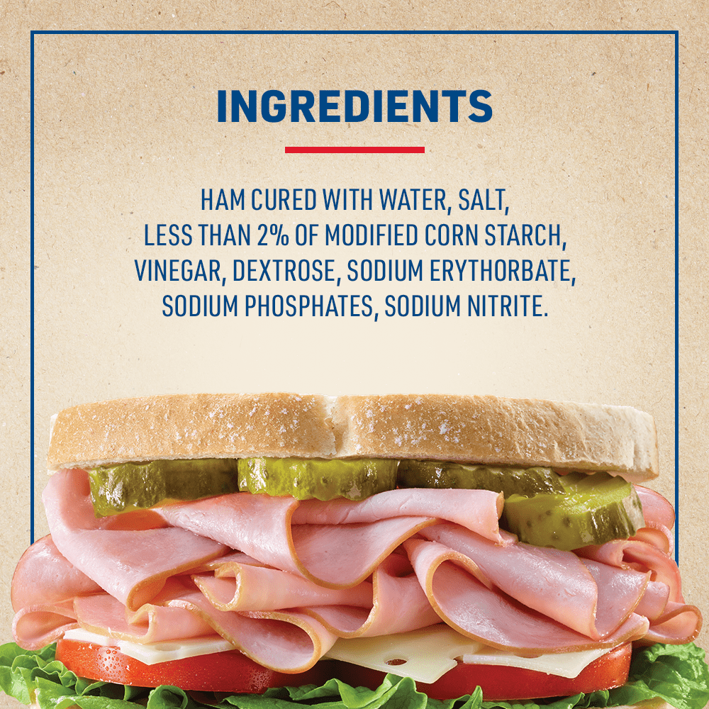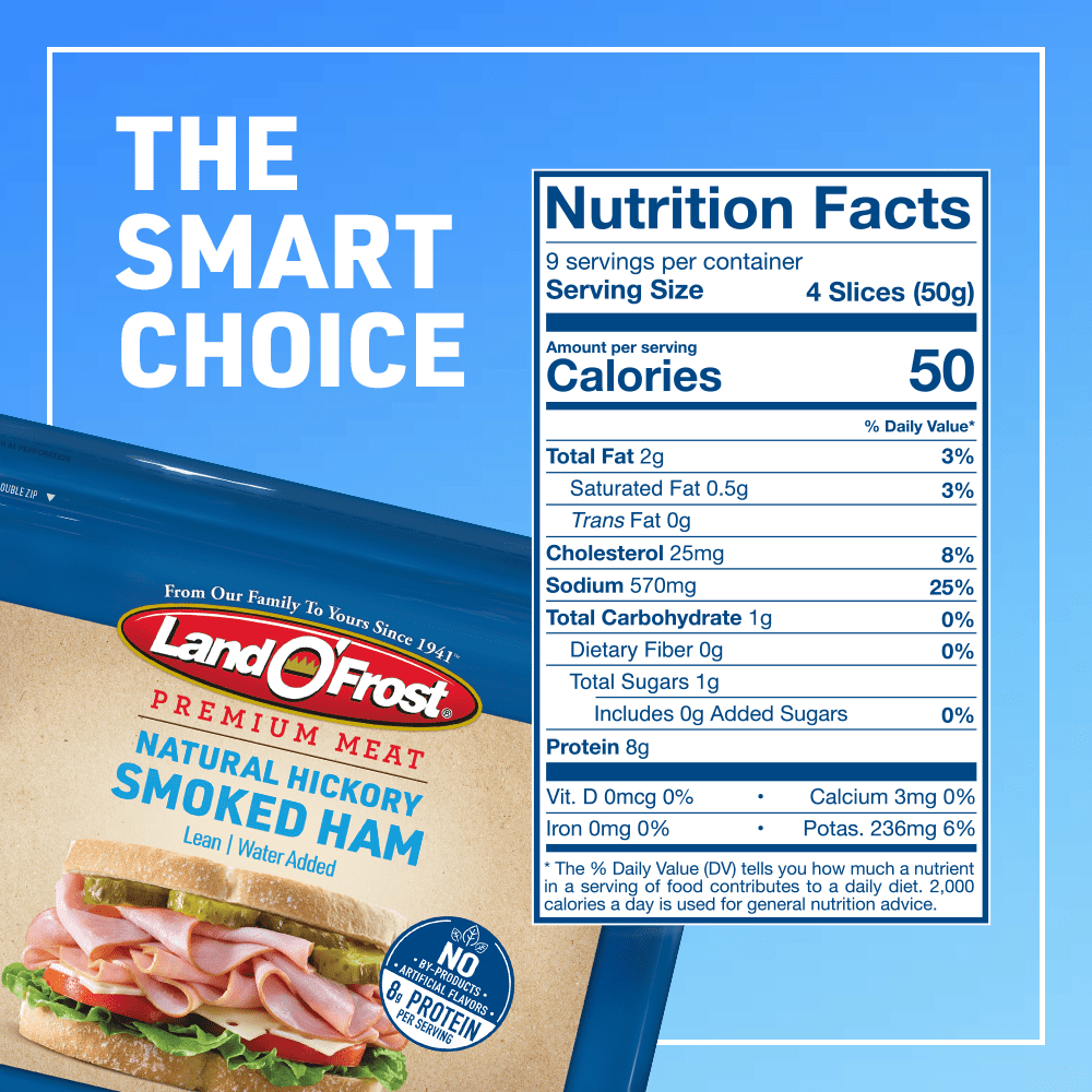 Our natural hickory smoked ham is tender, naturally hardwood smoked, and made without artificial flavors, added hormones, or by-products. Naturally gluten-free, this lean ham has 2 grams of fat and 60 calories per 4-slice serving, providing a protein-packed choice for any meal. Comes in a resealable plastic pouch to maintain freshness.