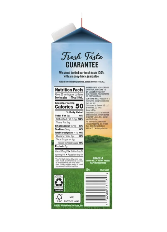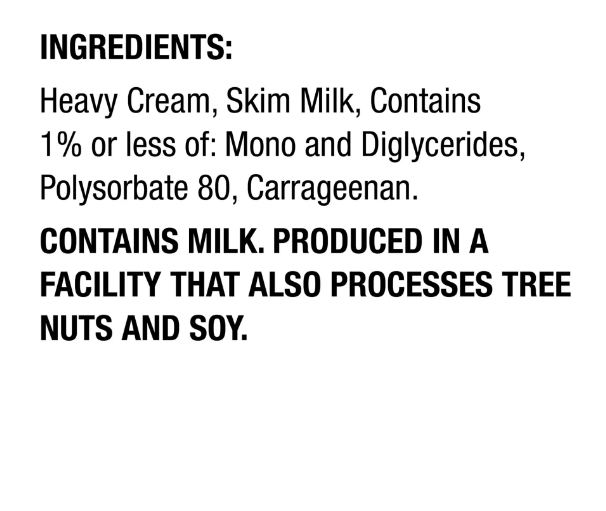 Heavy Cream; Skim Milk; Contains 1% or less of: Mono and Diglycerides; Polysorbate 80; Carrageenan.