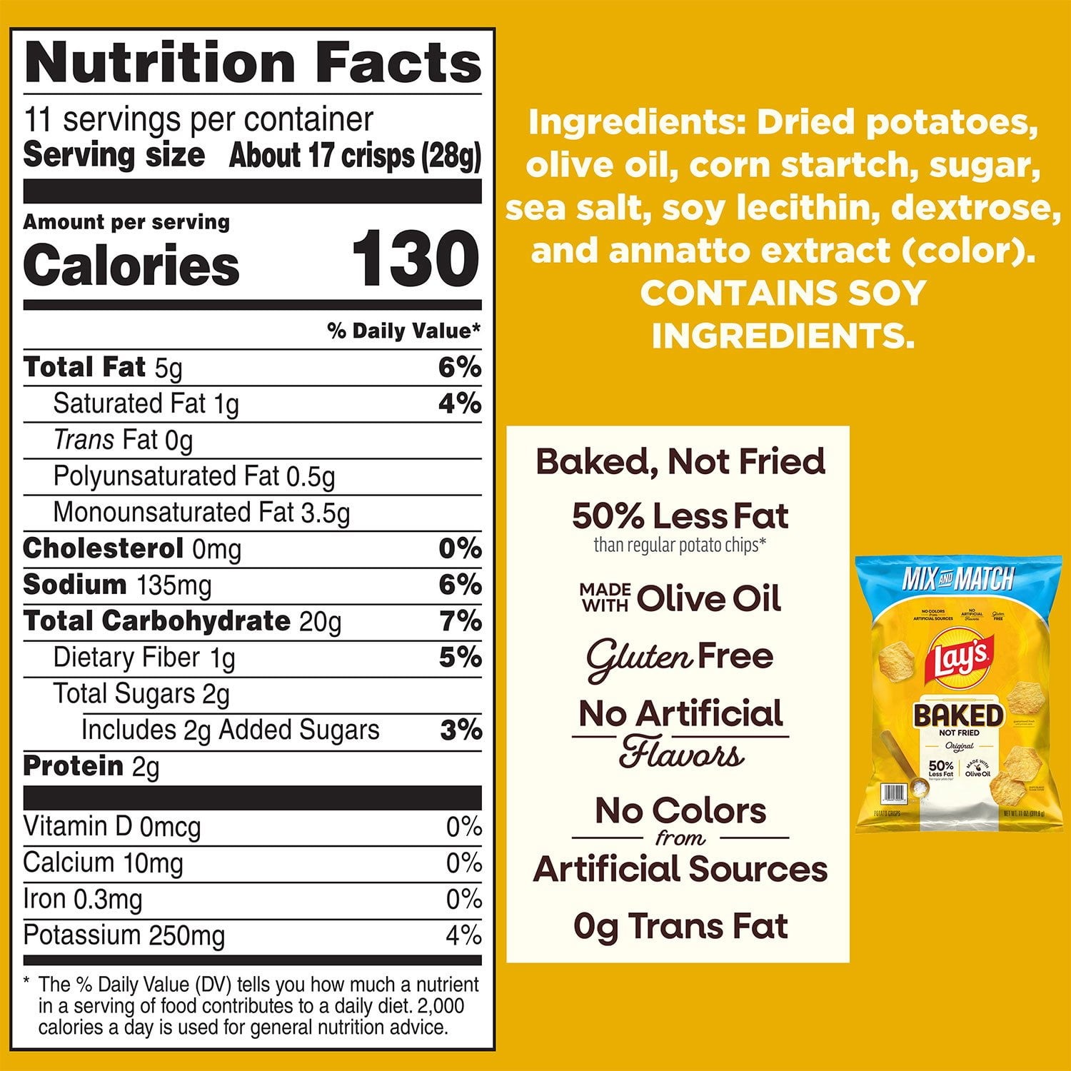 Frito-Lay’s line of baked snacks, including Lay's Classic Potato Chips, are baked, not fried. This gives you the great taste you’ve come to love with Frito-Lay snacks, but with less fat than regular potato chips. It's a healthier choice without compromising on flavor.